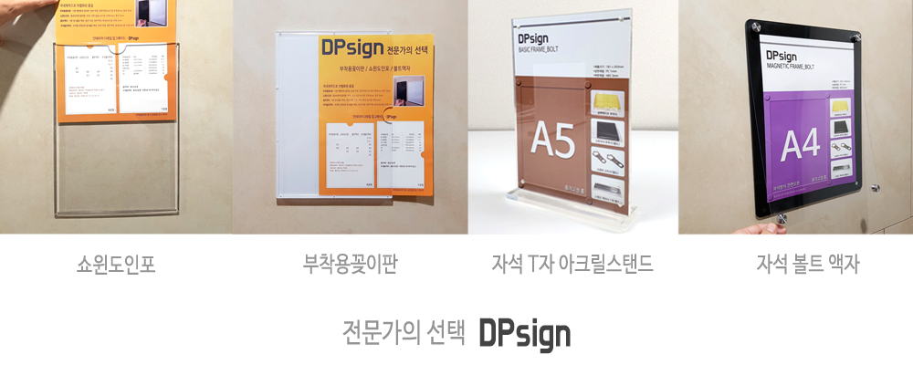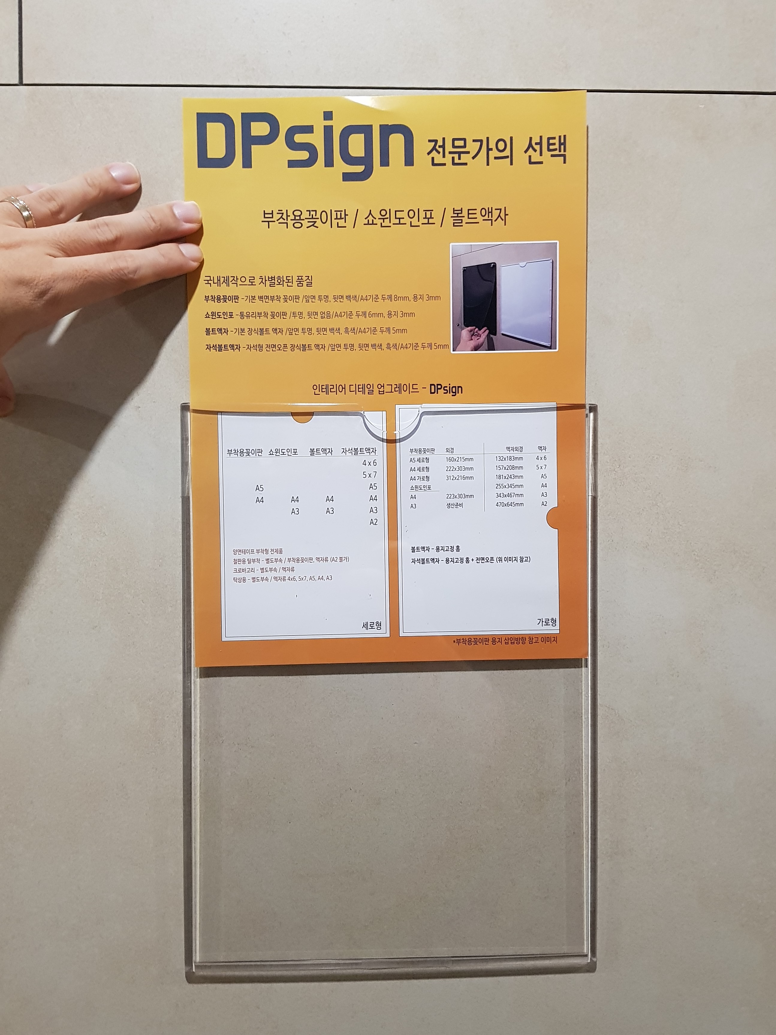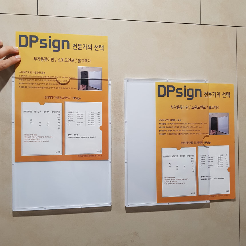 사무실 벽면 유리면에 필요한 다양한 크기의 게시물을 편리하게 넣고 뺄수 있는 디피사인 꽂이판